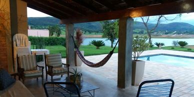 Varanda com rede para apreciar o por do sol! Um belo jardim compõe a margem do Lago de Furnas junto a piscina!